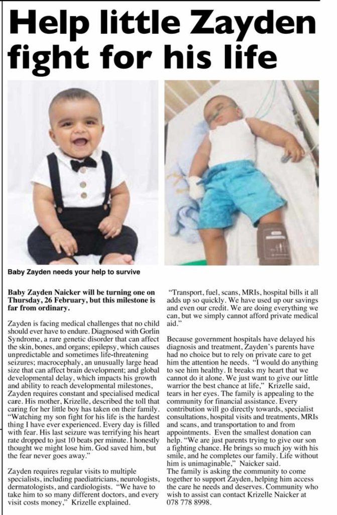 Community members who wish to offer support can contact Krizelle Naicker directly on 078 778 8998. Zayden’s parents have stated that any amount contributed will be used exclusively for his medical requirements and that he continues to require ongoing specialised intervention to manage his conditions.