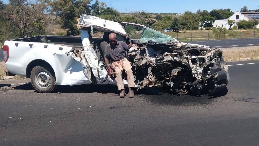 The incident involved a white Ford Ranger pickup truck that sustained extensive damage, including a crushed front end, exposed engine, and deformed cab. The adult male driver was found sitting beside the wreckage, conscious and able to sit without assistance, though blood was visible on his clothing and hands.