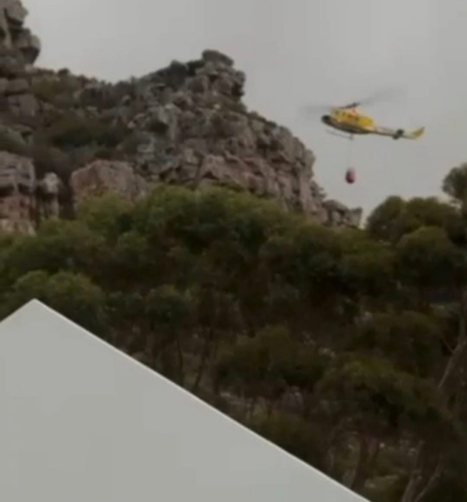 The aircraft was engaged in water-bombing duties as part of efforts to contain an active veld fire burning in the Vlakkenberg area and spreading across slopes above Hout Bay and towards Constantia Valley. The helicopter’s main rotor blade struck the rocky mountainside during a water drop, causing the aircraft to lose control and come down on the steep terrain. Video footage of the incident shows the helicopter flying low over burning vegetation before the impact and subsequent plume of smoke.