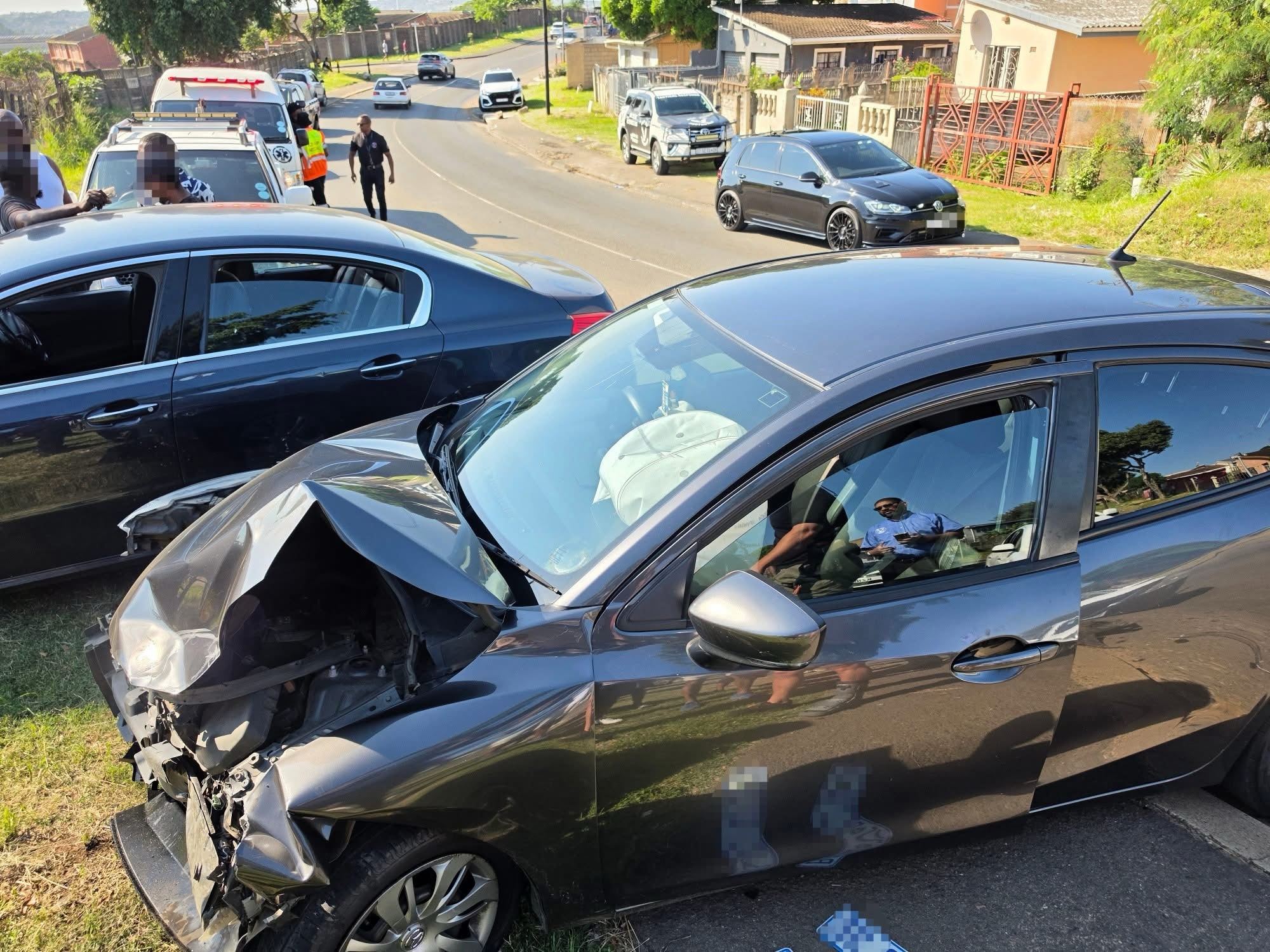Phoenix, KwaZulu-Natal – A group of five armed suspects travelling in a grey Mazda 2 carried out three failed hijacking attempts in the Redfern and Whetstone areas on Thursday morning before losing control of their vehicle and crashing head-on into another car on Fernham Drive.