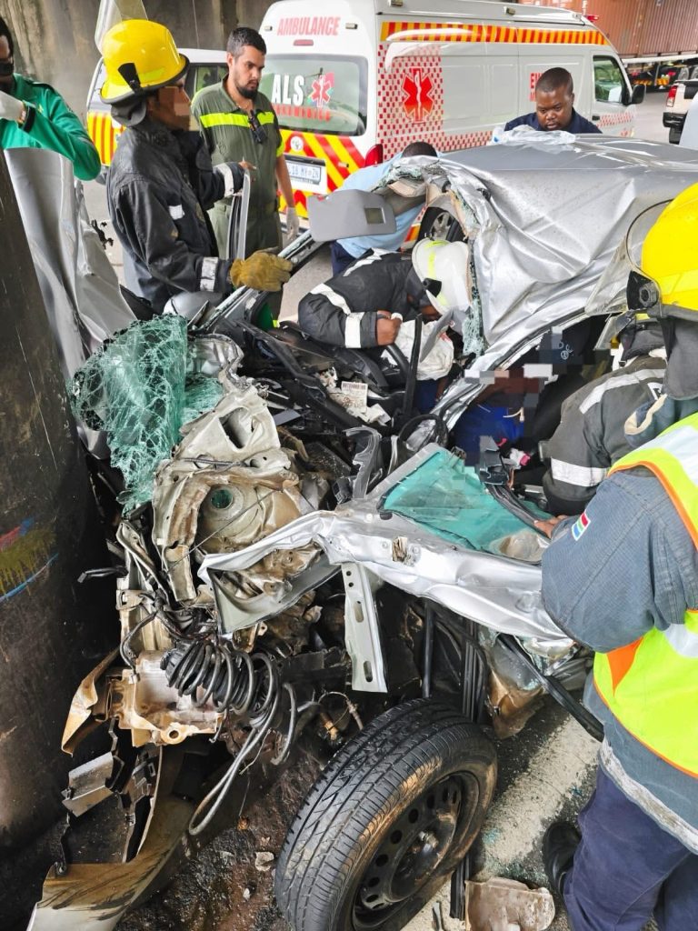 Durban, South Africa – March 1, 2026: Emergency responders are attending to a major accident on the M7 highway in the Bluff-bound direction, directly beneath the N2 bridge. The incident involves vehicle entrapments, requiring specialized extraction efforts.