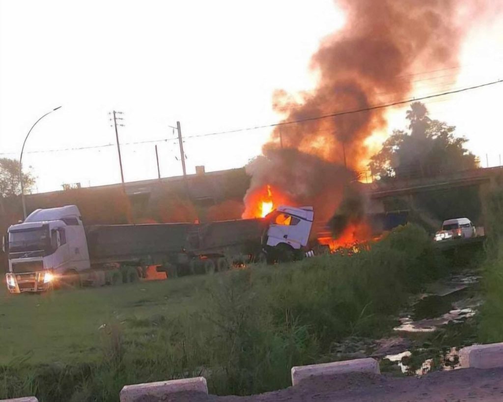 The incident took place on the section of the N10 heading towards Middelburg. One truck struck the rear of the vehicle ahead while both were travelling under the railway overpass. The force of the impact caused one of the trucks to catch fire shortly afterwards, with thick smoke filling the area beneath the bridge.