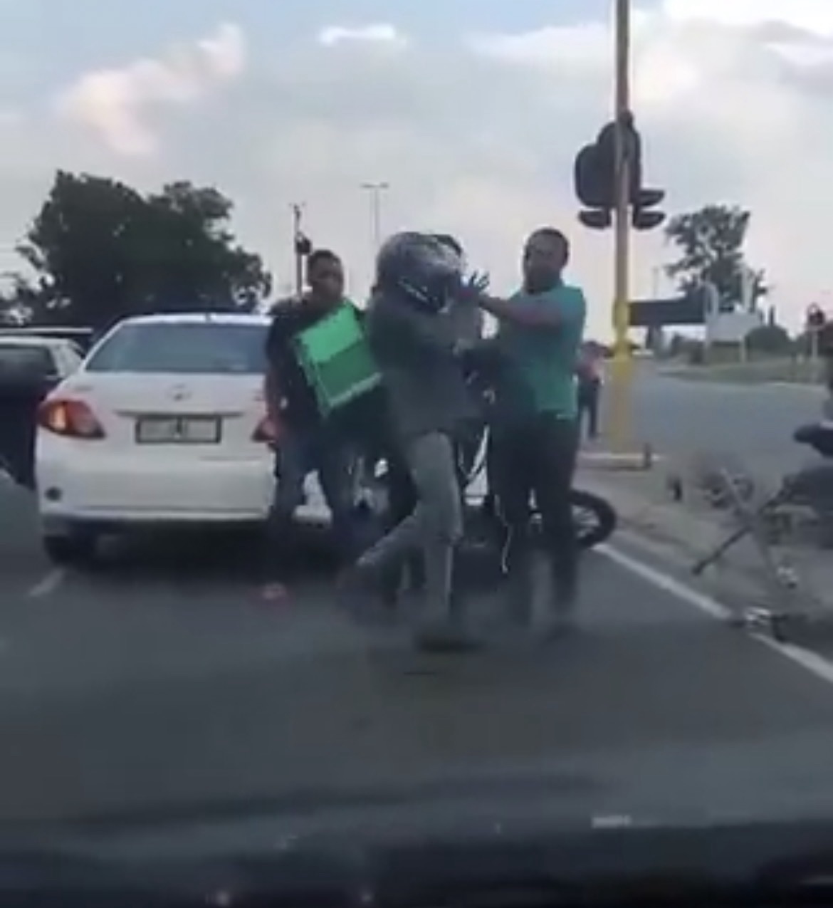 The footage, captured from inside a nearby vehicle, depicts the driver being pulled off his motorcycle and physically attacked. The motorcycle bears the branding of Checkers Sixty60, a grocery delivery service operating in South Africa.